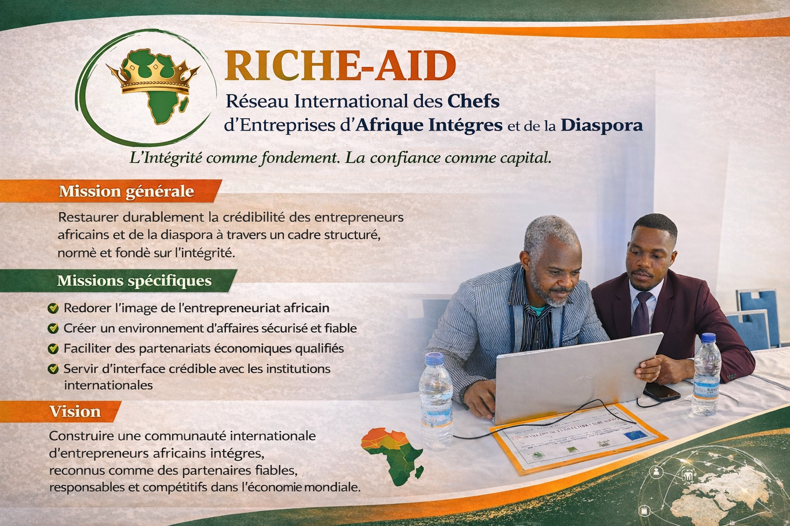 MISSION GENERALE RICHE-AID Restaurer durablement la crédibilité des entrepreneurs africains et de la diaspora à travers un cadre structuré, normé et fondé sur l’intégrité.