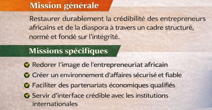 Nous œuvrons à la mise en place d’un cadre structuré, normé et fondé sur l’intégrité, afin de promouvoir un entrepreneuriat responsable, compétitif et conforme aux standards internationaux.